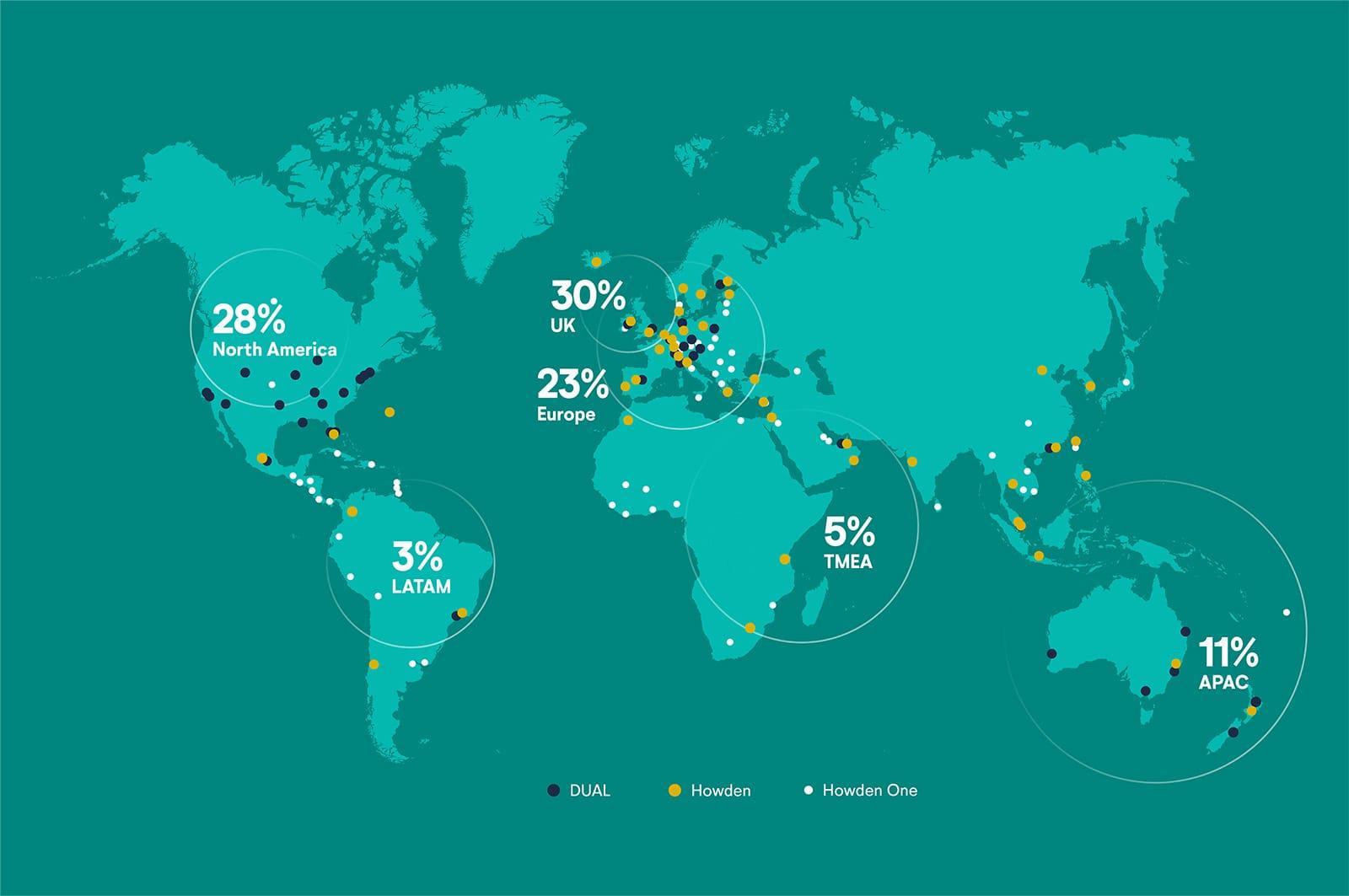 La red Howden One amplía la representación de Howden a más de 95 territorios en todo el mundo, lo que supone una mayor capacidad para los clientes con exposición internacional. Las 50 empresas asociadas y los 10.000 especialistas de Howden One añaden mayor profundidad y flexibilidad a la forma en que prestamos servicios a los clientes.
